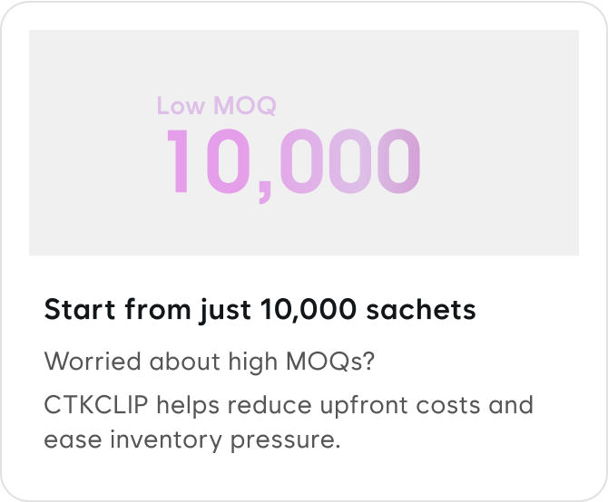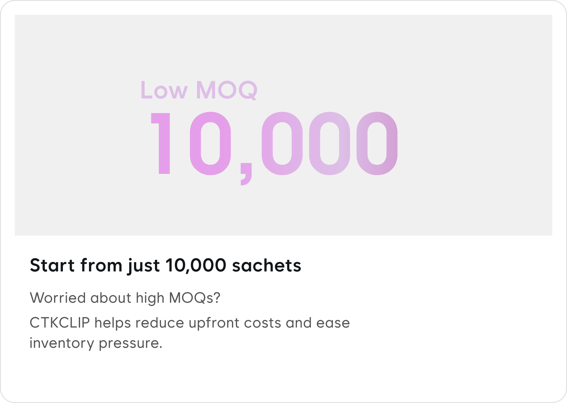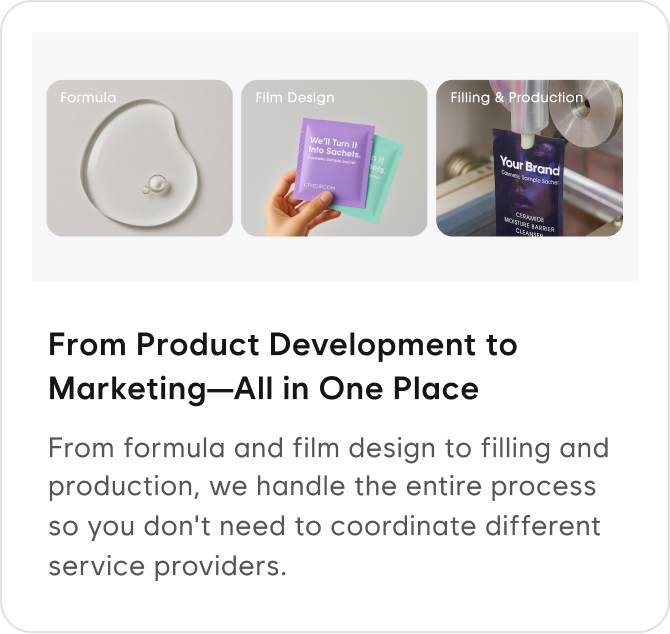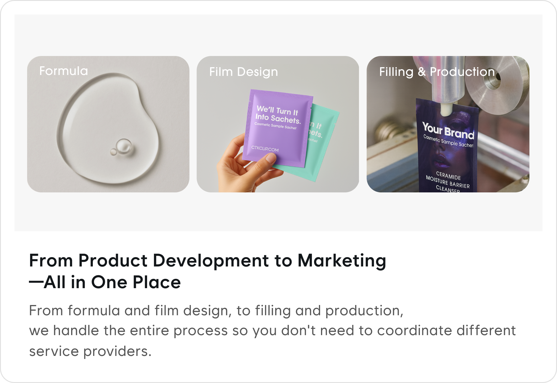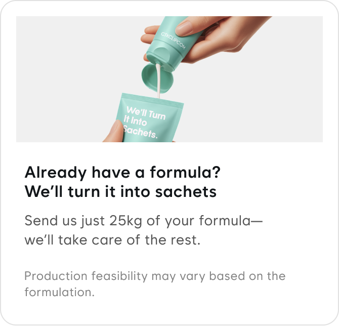 샤쉐는 단위당 제형 사용량이 적어 본품과 병행 제작 시 생산 효율과 확장성이 높아집니다. 또한 여러 업체와 따로 소통할 필요 없이 CTKCLIP에서 통합 관리하므로 시간과 커뮤니케이션 부담을 줄일 수 있습니다.