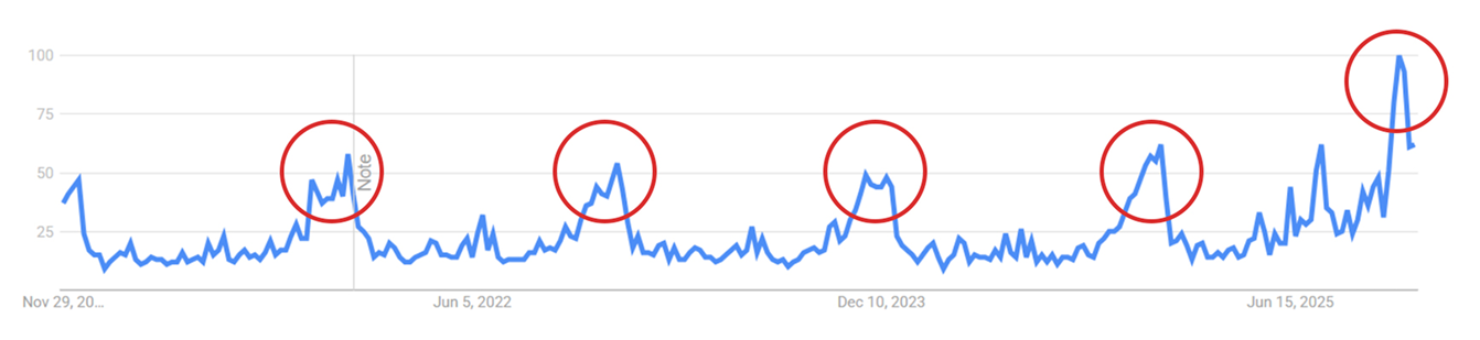 Google Trends for “Holiday Care” show consistent peaks in November–December over the past five years, with this year reaching the highest peak yet. This proves the niche and need for care especially during the Christmas season.