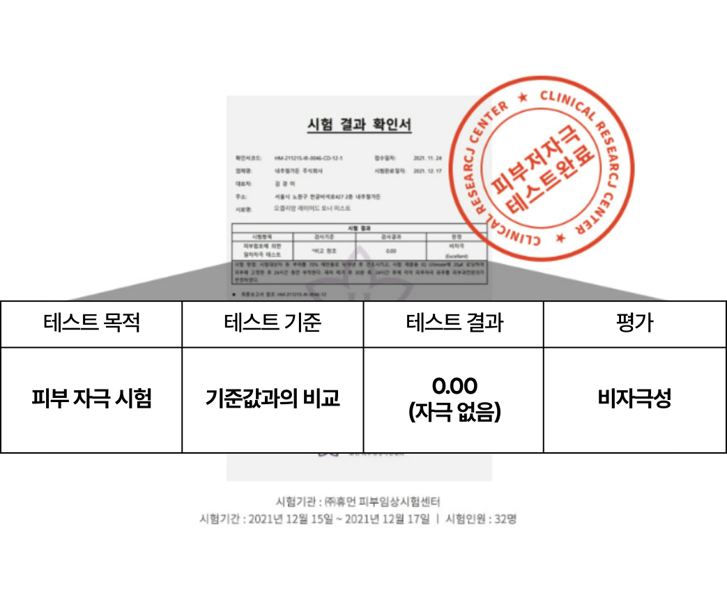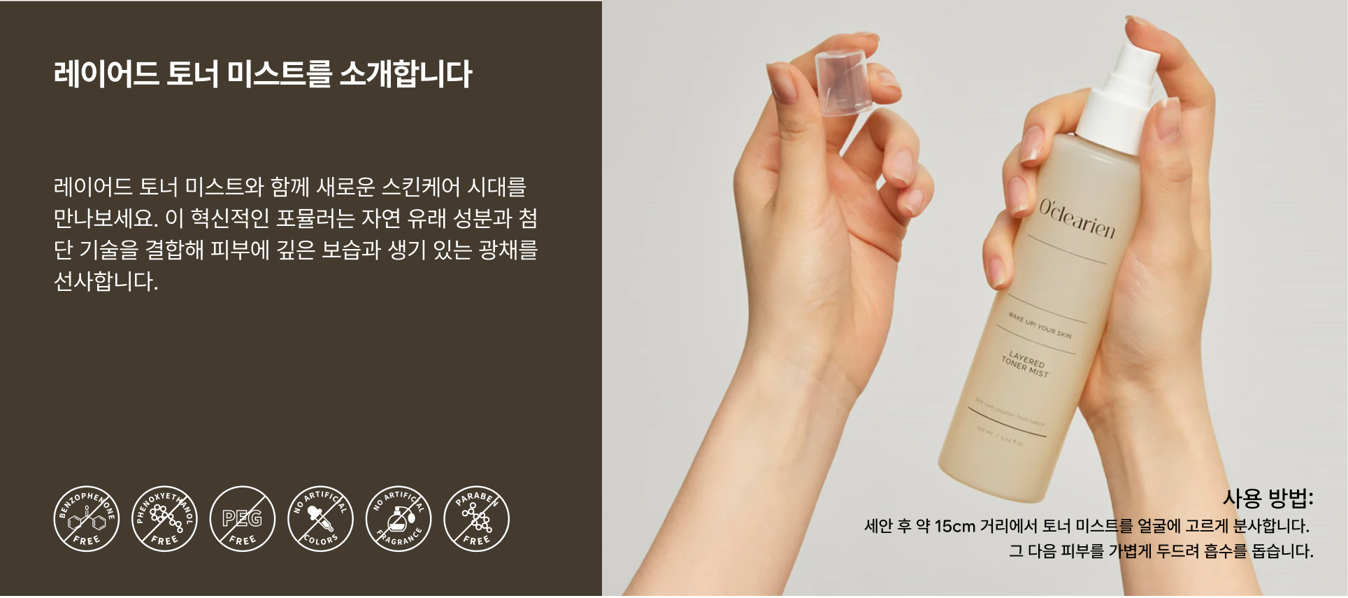 오클레리언 레이어드 토너 미스트는 피부에 안전하고 자극이 없도록 임상 시험을 거쳤습니다. 글로벌 의학 연구 센터에서 실시한 피부 자극 시험에서, IQ Ultimate® 방법을 사용하여 32명의 참가자에게 제품을 24시간 동안 도포했습니다. 테스트 결과 자극 점수 0.00을 기록하여, 토너 미스트는 피부 자극이 없으며 “우수” 등급을 받았습니다. 피부 보호와 케어를 지원하면서도 자극을 최소화하는 엄선된 성분으로 구성된 오클레리언 레이어드 토너 미스트는 부드럽고 효과적인 스킨케어를 원하는 분들에게 믿을 수 있는 선택입니다.
