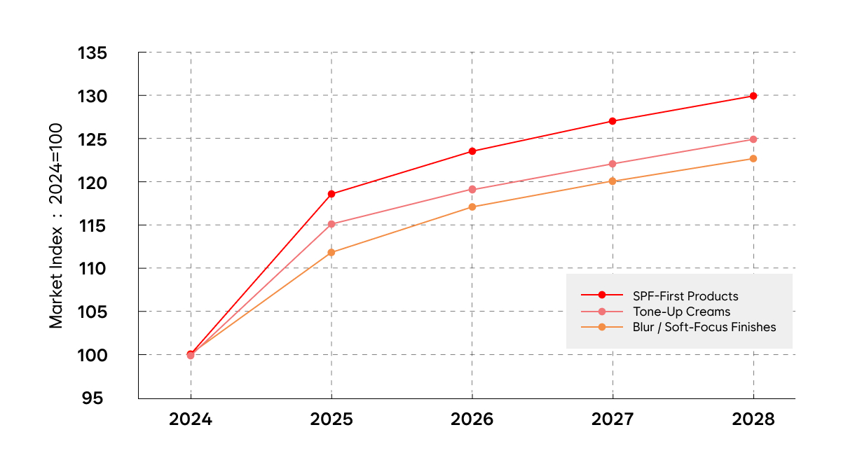 * SPF 중심 제품: 2028년까지 +30% 성장 * 톤업 크림: 2028년까지 +23% 성장. * 블러 / 소프트 포커스 마무리: 2028년까지 +25% 성장