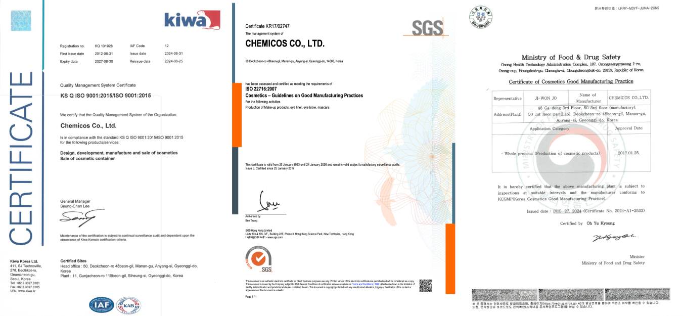 케미코스는 ISO9001과 ISO22716 인증을 기반으로 개발부터 생산, 품질 관리까지 모든 과정을 일관된 기준으로 운영합니다. 제형 개발과 패키지 엔지니어링이 하나의 프로세스처럼 연결되는 구조는 브랜드가 원하는 감각을 흔들림 없이 제품으로 구현하는 기반이 됩니다. 케미코스에게 ‘완성도’는 선택이 아니라, 제품이 소비자에게 닿는 마지막 순간까지 이어져야 하는 책임입니다.